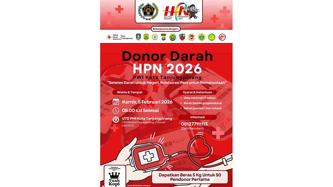 Mengusung tema “Setetes Darah untuk Negeri, Kolaborasi Pers untuk Kemanusiaan”, donor darah dijadwalkan berlangsung pada Kamis, 5 Februari 2026, mulai pukul 08.00 WIB hingga selesai. Lokasi kegiatan terpusat di Unit Transfusi Darah (UTD) PMI Kota Tanjungpinang, Jalan Rumah Sakit Nomor 32.