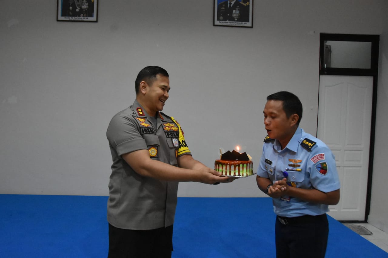 LIDIKNUSANTARA.COM – Silaturahmi diawali dengan mengunjungi Markas Lanudal Tanjungpinang dan memberikan Kue ulang tahun yang langsung diterima oleh Komandan Lanudal Tanjungpinang Letkol Laut (P) Dani Achnisundani, SE, M.Tr.Harla didampingi Pejabat Utama dan anggota Lanudal Tanjungpinang. Komandan Lanudal Tanjungpinang mengucapkan terimakasih atas kunjungan silaturahmi Kapolres Tanjungpinang beserta jajaran, semoga Sinergitas TNI – Polri khususnya di Tanjungpinang semakin terjalin erat, solid dan harmonis.
