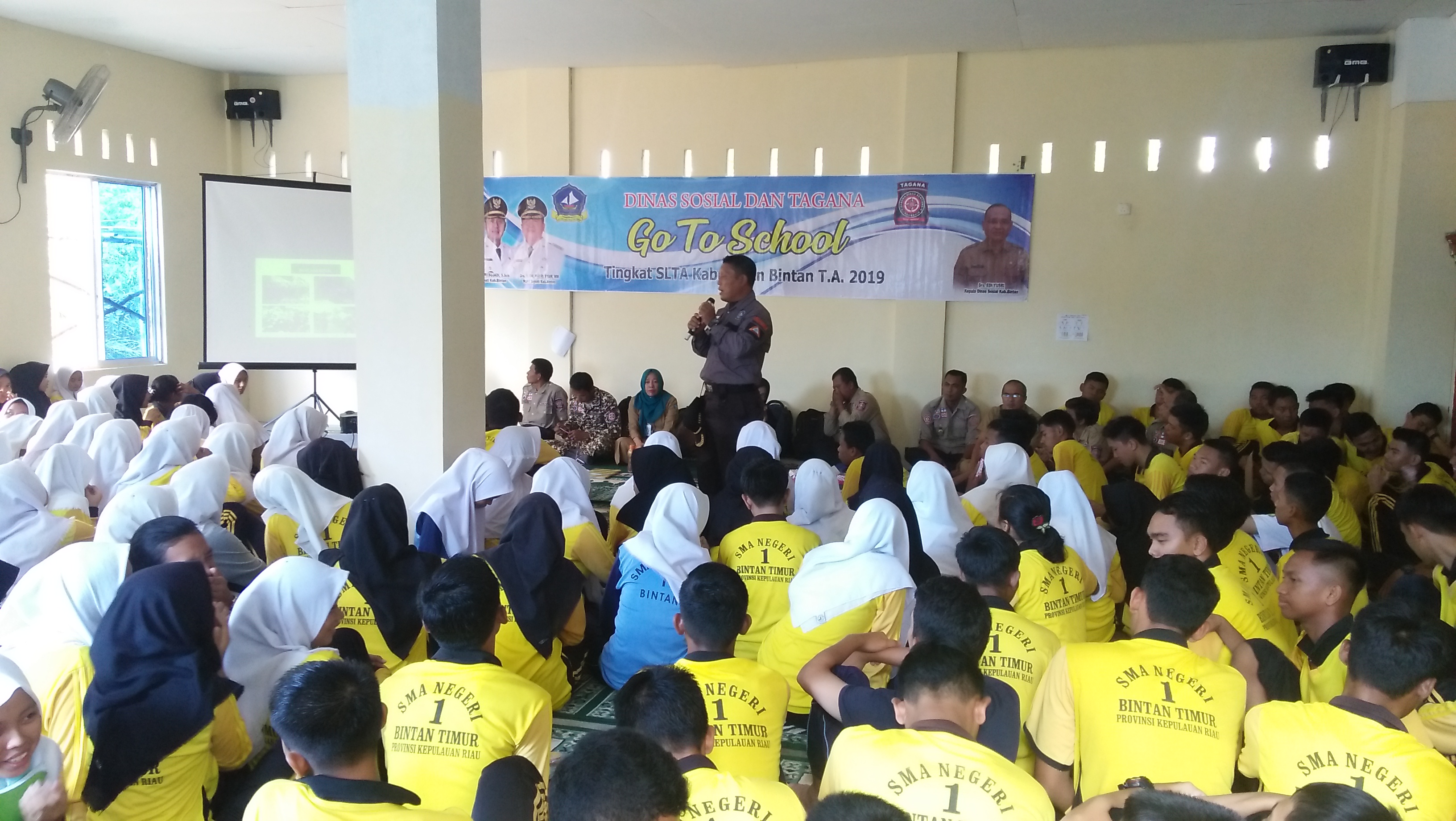 BINTAN – Dinas Sosial Kabupaten Bintan bersama Taruna Siaga Bencana (Tagana) mengadakan kegiatan Tagana go to School, yaitu sosialisasi mengenai mitigasi atau penanggulangan bencana kepada siswa siswi SMA di Kabupaten Bintan. Sosialisasi tersebut akan diadakan selama lima hari, dimulai dari hari ini, Senin (04/11) hingga Jum’at (08/11). Dengan hari pertama berlangsung di SMAN 1 Bintan Timur, Jl. Korindo Km. 21, Kelurahan Sei Lekop, Kecamatan Bintan Timur, Kabupaten Bintan.