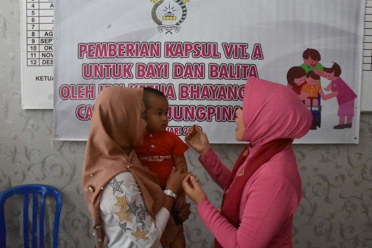 TANJUNGPINANg- Bhayangkari Cabang Tanjungpinang menggelar Bhakti Kesehatan Pemberian Vitamin A untuk Bayi dan Balita, bertempat di Posyandu Nenas 1 Kemala Bhayangkari, Polres Tanjungpinang, Selasa 4 Pebruari 2020.