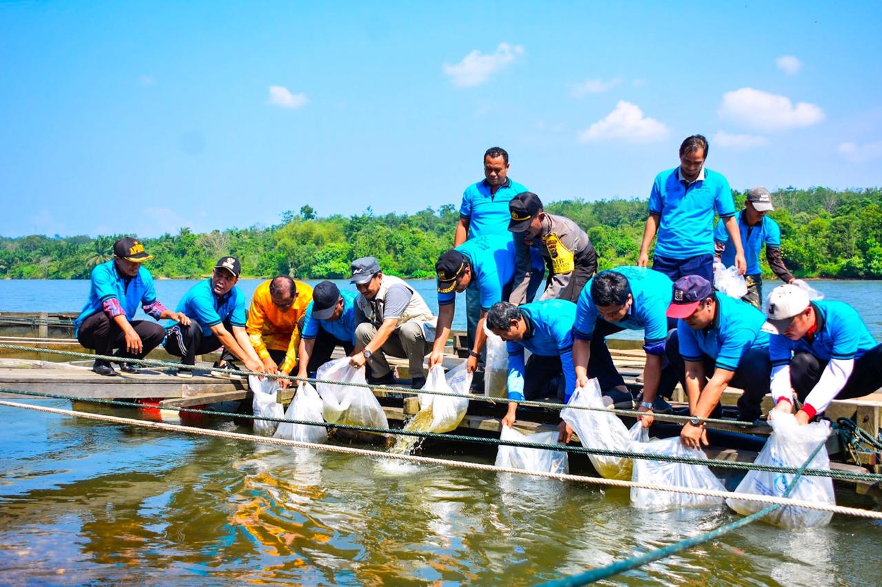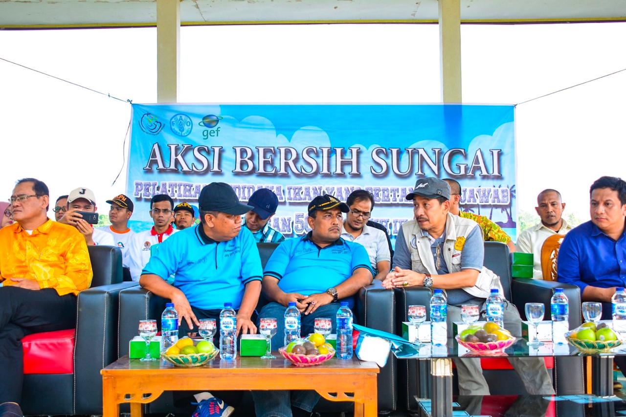 KAMPAR (RIAU) – Acara Implementasi dari kesepakatan kerja sama antara Kementerian Kelautan dan Perikanan (KKP) dengan food and Agriculture Organisation (FAO) dalam program ‘Mainstreeming Biodiversity Conversation and Sustainable Use Into Inland Fisheries Fractires in Freshwater Ecosystems of High Conversation Value (I-fish) and SEAFDEC’ serta menindaklanjuti perihal kegiatan bersih sungai dan pelatihan budidaya yang bertanggung jawab, di lapangan kantor desa Pulau Terap, Kecamatan Kuok, Kabupaten Kampar, Sabtu (27/7/2019) Kemarin.
