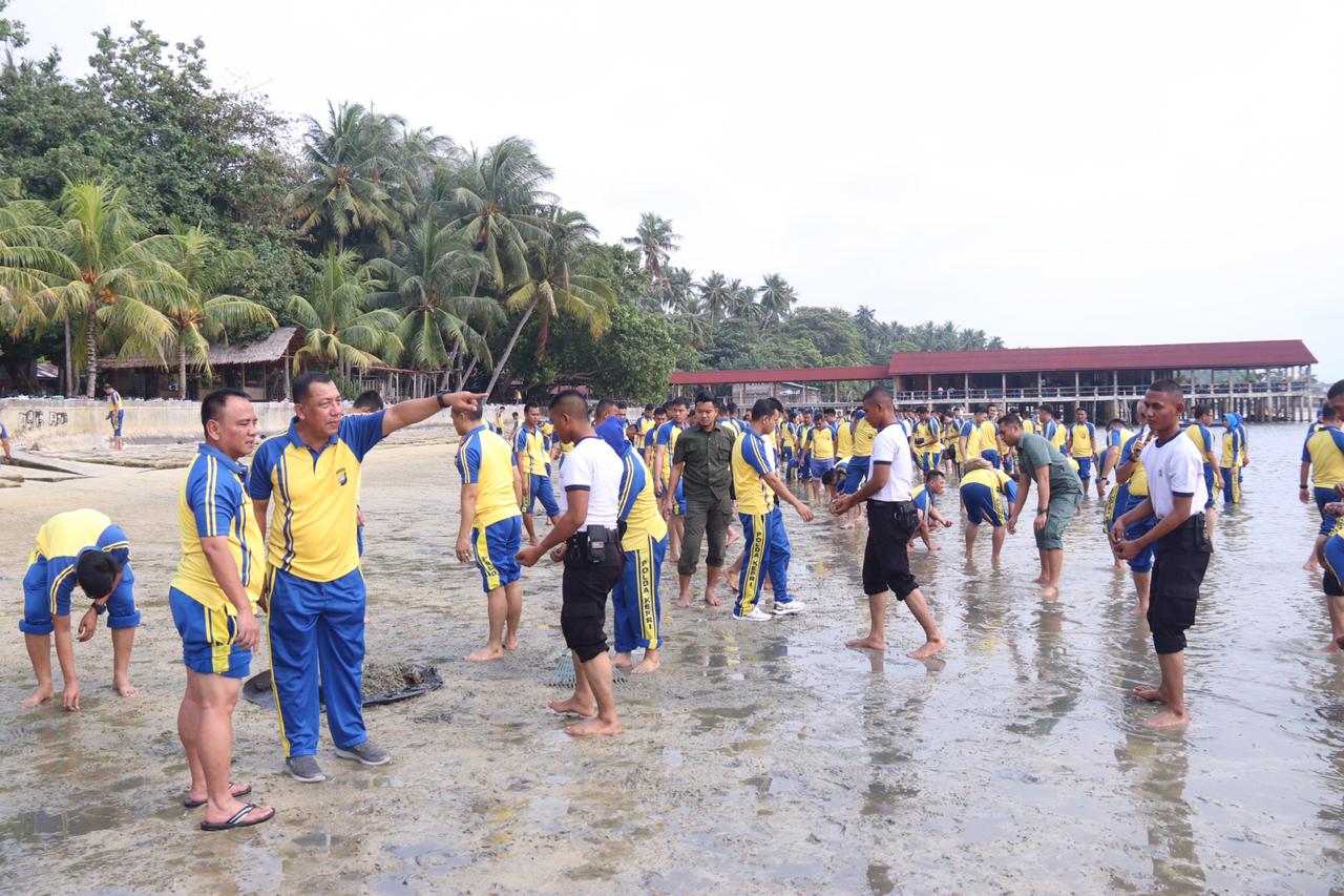 LIDIKNUSANTARA.COM – Pantai Payung, Batu Besar, sepanjang 500 meter dipenuhi oleh personel Polri menyisir sampah-sampah plastik, beling dan benda-benda tajam lainnya yang dapat membahayakan masyarakat yang berwisata di Pantai tersebut.